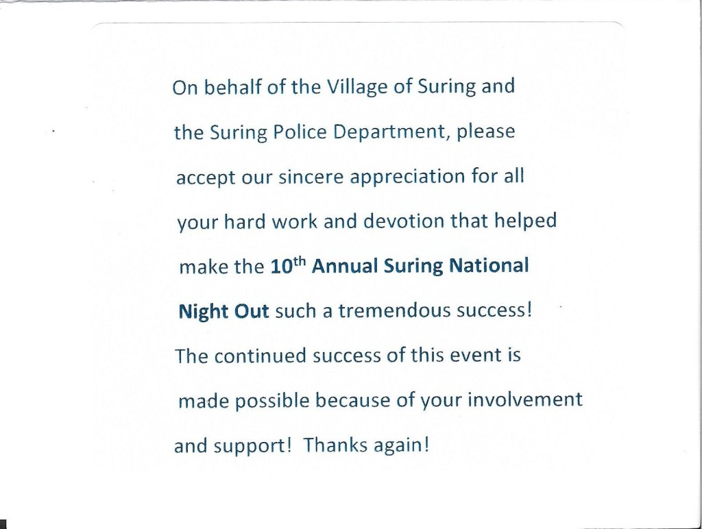 The Suring National Night Out was a lot of fun for everyone who attended. There were plenty of things to do for the kids, snacks to enjoy, prizes, and free icecream! It was organized by the Suring Police Department and featured Oconto County Sheriff’s Dept., area emergency responders and first responders, and all area fire departments. Many area organizations were present, as well as, the Business Association of Suring, many donors and volunteers!
