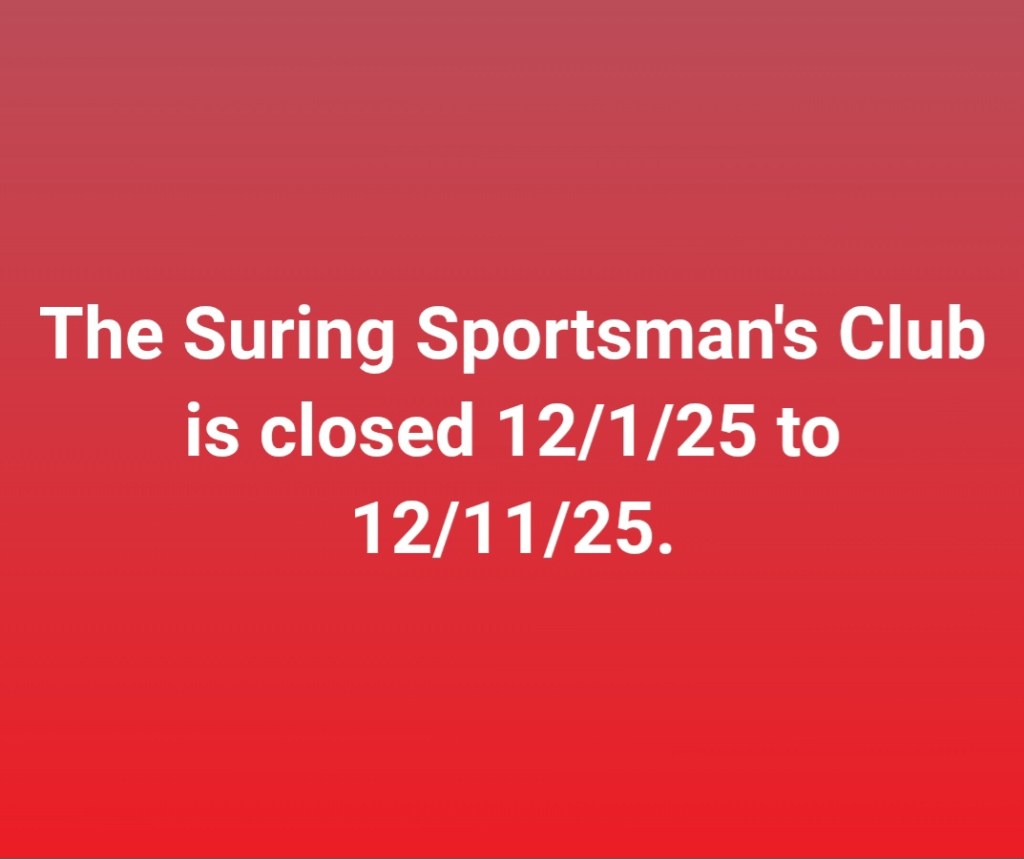 The Suring Sportsman’s Club is closed from 12/1/2025 to 12/11/2025!